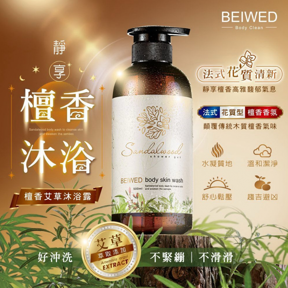 台灣 BEIWED檀香艾草沐浴露 500ml 有別於傳統的檀香氣味,經由專業調香師完美比例調配出奢華低調的法式香調 沐浴後的淡淡香調,高雅又清新, 有助於舒緩一整天疲憊的身心靈,獨特的潤肌配方,保濕不乾澀,讓您靜享檀香沐浴好時光! 🍀擺脫厭世第一步,就是洗香香!🛀 🛀🛀🛁🛁 古人對於艾草、檀香的評價極高。🏆🏆 採用檀香、艾草植萃,味道清新的舒服氣息, 不同於一般市售檀香開架商品,非常的高雅清香。 洗後神清氣爽,壞運掰掰,好運🍀來。 出入喪家醫院後,輕鬆洗淨除穢招吉納祥。💖 珍貴檀木沉穩的木質香氣、再搭配花質檀香、 經由專業調香師以黃金比例、調配出更完美的氣味, 能更有助舒緩情緒上的壓力、平靜緊張的心靈。 溫和親膚保濕因子💦讓你洗後肌膚柔嫩不乾澀💖 輕鬆享受沒負擔的純淨沐浴✅ 《本草綱目》裡頭同時記載檀香的特性使身心達到寧靜,「檀木味清香、能入藥。點燃檀香;能安神定魄,調理上行之氣、達身、心、靈之淨化。」
