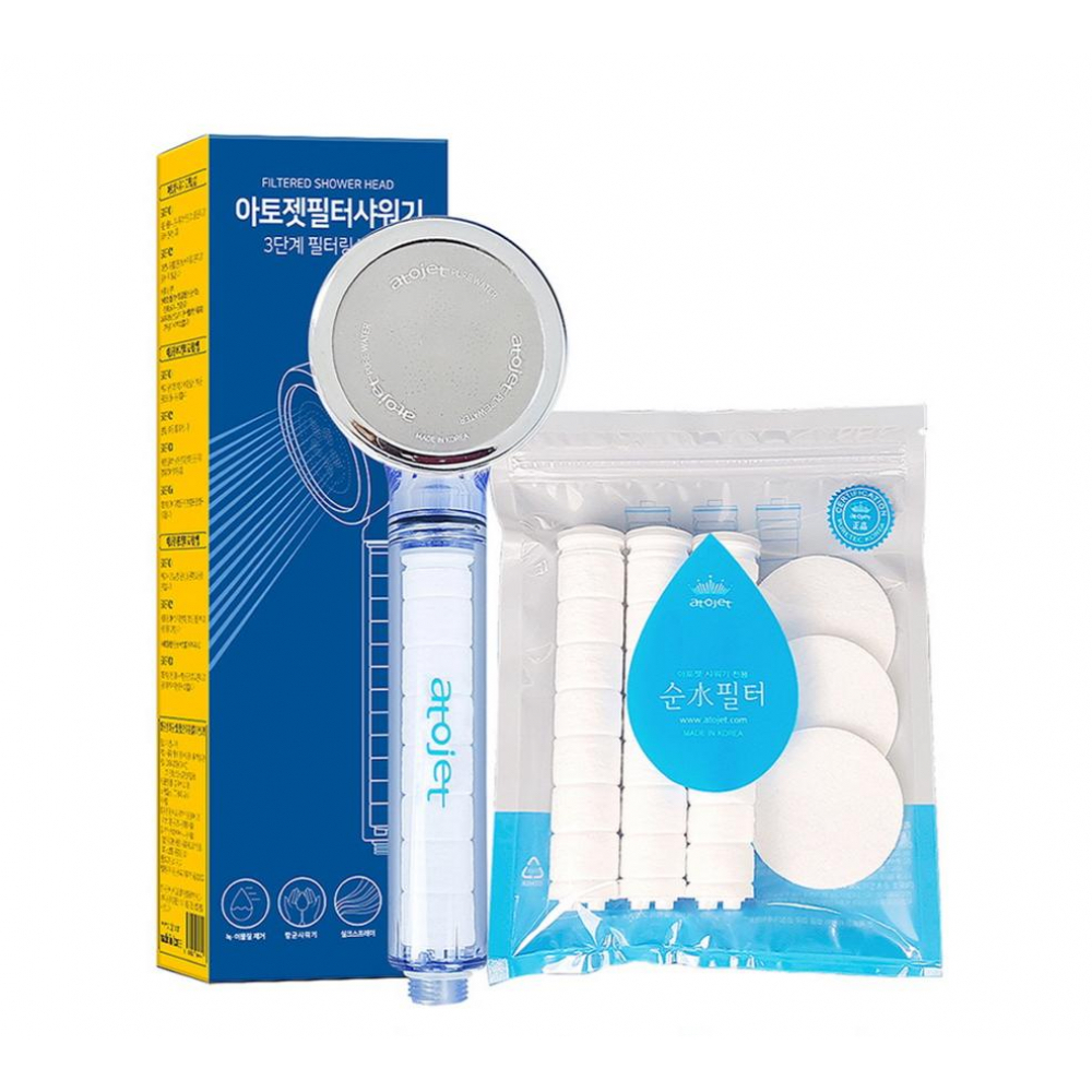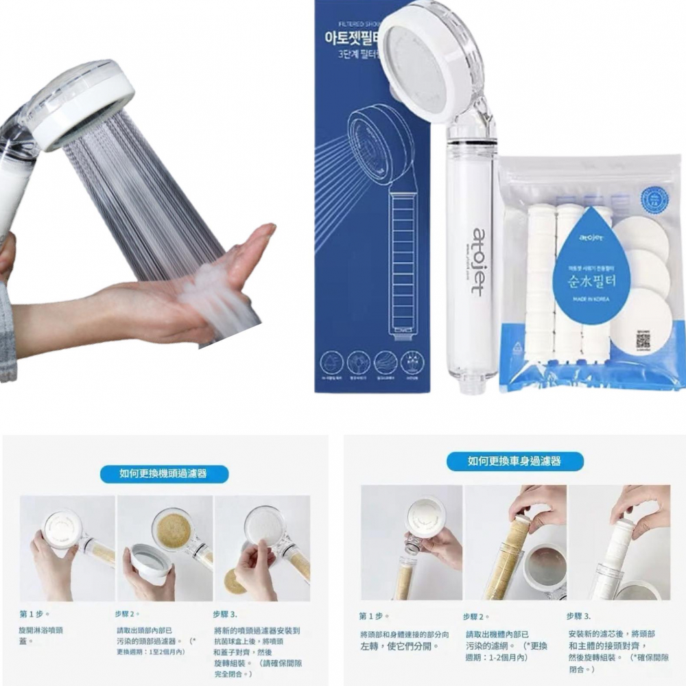韓國🇰🇷Atojet純淨完美過濾套裝 套裝包括: 過濾蓮蓬頭 x 1個 濾芯3支+濾片3片 x 1包 🛁 Atojet 濾淨蓮蓬頭的日常奇蹟: ✔ 洗完肌膚更滑順,敏感膚質不再刺癢 ✔ 明顯減少背部粉刺、痘痘反覆 ✔ 水流細緻柔和,洗感升級宛如溫泉 ✔ 濾芯可替換,天天都是乾淨新水質 ✔ 全韓國製造,無中國零件,安心又耐用 《Atojet 濾淨蓮蓬頭》✨ 韓國旅人出國必備的淨水神器!出國旅遊最怕水不乾淨,尤其在東南亞、歐洲等水質較差地區,鐵鏽、雜質、氯氣洗一次就讓肌膚過敏、長疹子甚至發癢 😖Atojet 採用多層高效濾芯,有效過濾水中有害物質,洗感舒適又安心。 🔥 熱銷重點: ✔ 全韓國製造,零中國製零件 ✔ 多層濾芯+可替換設計,水質乾淨看得見 ✔ 強效加壓,洗澡超療癒 ✔ 體積輕巧、適用全球接頭,旅行/住宿都可用 ✔ Jennie 本人愛用推薦! 濾芯可使用約 2-3 個月(取決於水質和使用頻率)。 安裝簡單: 只需拆卸現有淋浴噴頭,將軟管連接到主機即可。無需特殊工具或技能。