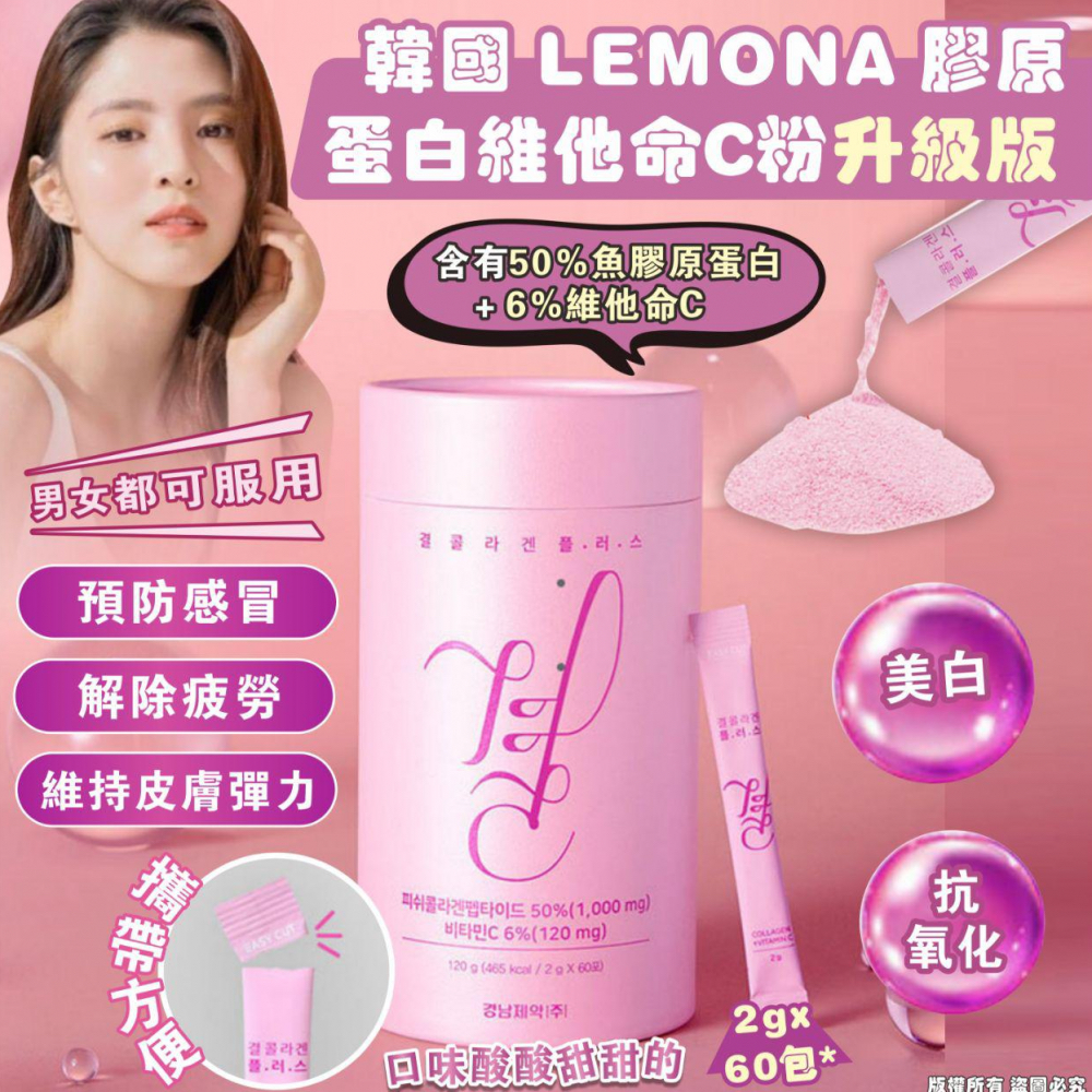 韓國🇰🇷 LEMONA 膠原蛋白維他命C粉升級版 (2g x60包) 一盒60年小包, 每包2g, 足夠2個月份量,男女都可服用👨👩 🇰🇷韓國暢銷的補充膠原蛋白產品 👌有助於提高免疫力,預防感冒,解除疲勞 👌美白、抗氧化、維持皮膚彈力 🔥即食型超級方便,每一小包2g 💥包含一日所需維生素C和膠原蛋白 👌吸取安全劑量 LEMONA 膠原蛋白維他命C粉主要成分爲膠原蛋白和維生素C、B2、B, ✨成分天然安全,✨口味酸酸甜甜的,好味易入口 🔥每包含有50%魚膠原蛋白+ 6%維他命C 採用2奈米超細分子魚類膠原蛋白 😉維持皮膚彈性、透亮膚色、抗氧化 ☺提高免疫力、解除疲勞 ☺強化指甲、頭髮、骨骼 上班疲勞者、愛美女仕、長期熬夜,都適合服用!懷孕或哺乳中的媽媽都可以食用 單獨包裝設計攜帶方便,隨身帶住每天一包 ⭕食用方法: ✅可每天一包直接撕開倒進嘴直接服用 ✅亦可將膠原蛋白粉添加到自己喜歡的飲品中,如水、咖啡、牛奶、果汁等都可以 產品規格:2g x60包 出產地:韓國🇰🇷