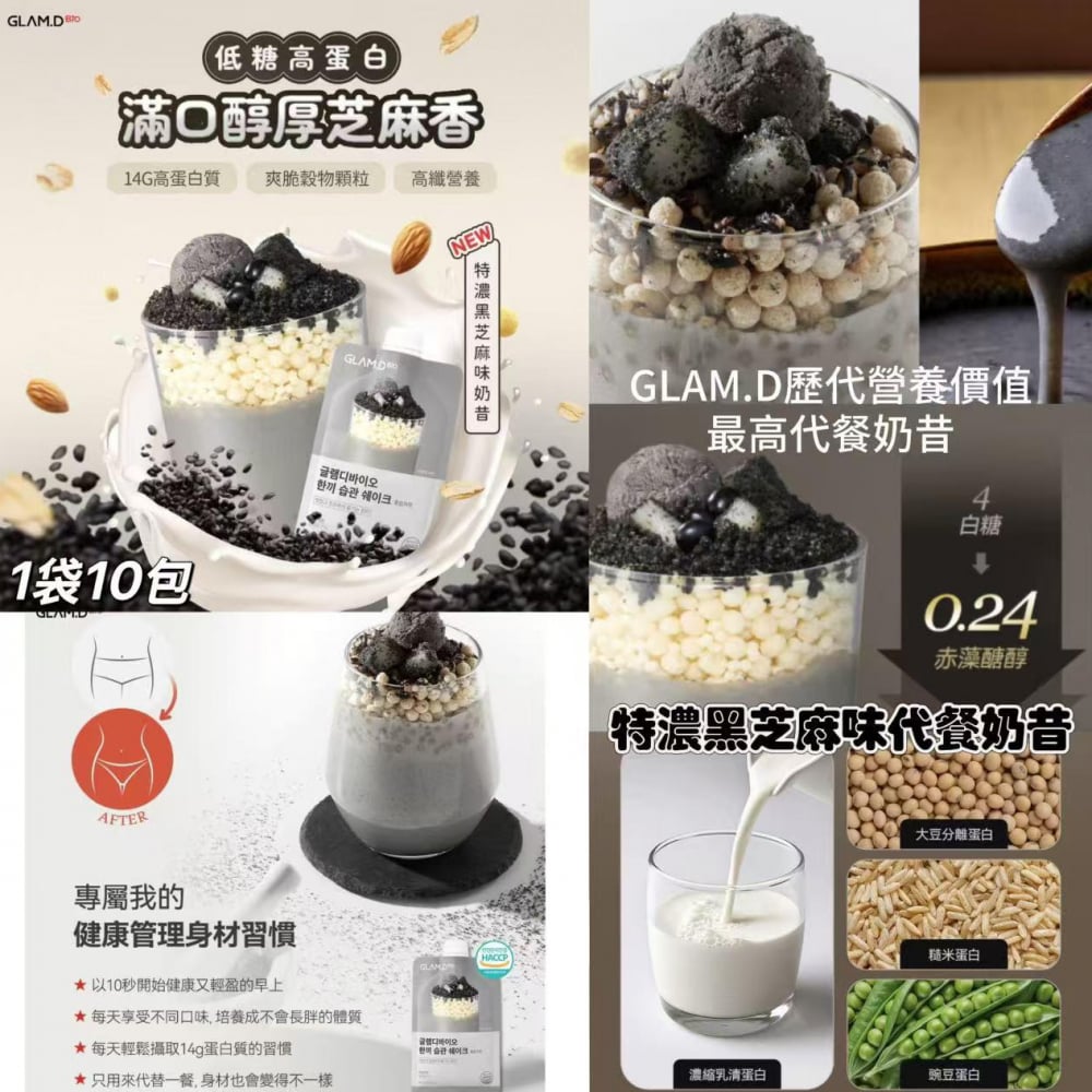 GLAM.D 特濃黑芝麻味代餐奶昔 (1袋10包)🎉 GLAM.D歷代營養價值最高代餐奶昔! ✔️低糖高營養 含有14g高蛋白質 ✔️一口充滿醇厚黑芝麻味 ✔️一包就飽滿高纖營養 ✔️改善頭髮健康及預防脫髮 ✔️隨時隨地方便享受 #極高蛋白質14g #一餐150卡 #17種營養穀物 #魅力代餐奶昔 #glamd奶昔 #減脂奶昔 #代餐 #減肥食譜 #代餐推薦 #韓國代餐